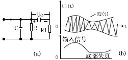 另一种切割失真是由于检波器的低频交流负载与直流负载电阻不同而引起的,通常检波被输出的低频电压经耦合电路[图7(a)中的R1C1]再送至低频放大器中去由于C1数值很大,(约为10微法)它的两端降有直流电压为载波幅度的平均值Uco若R1<R时,该电压大部分落在R两端上,以致在音频包络负半波时,输入电压可能低于R两端的直流电压,于是二极管截止,输出信号不再随输入信号包络的下降而改变,产生如图7-b的底边切割失真,要避免此失真,应满足下式