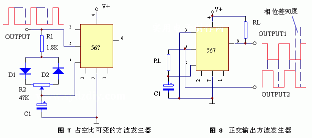 通用的567还可以用做可变波形发生器或通用锁相环电路。当其用作音调控制开关时,所检测的中心频率可以设定于0.1至500KHz内的任何值,检测带宽可以设定在中心频率14%内的任何值。而且,输出开关延迟可以通过选择外电阻和电容在一个宽时间范围内改变。