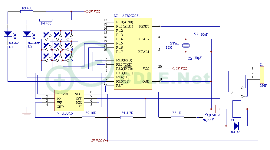 这个电路做好好久了,最久才有空把它写了个示例。很简单的小玩意儿,是用AT89C2051和X5045为主做一个密码控制器实验。使用X5045的看门狗功能可以使电路在受到干扰或特殊情况死机后,可以自动复位重启电路,使电路保持正常工作。使用X5045的数据读写功能,可以保存密码,也可以修改密码。本文附带的实例程序演示X5045的状态寄存器的读写、存储位的读写,里面的功能函数可以直接移植到别的程序中。电路上电后,红色LED亮,当按下按键时绿色LED闪亮一下,当按下"3,1,5,8,1,8",密码正确,红色LED灭,绿色LED亮,继电器打开,10秒后回到上电时的状态。当按下第一次按键后20秒内没有按下正确的键值,则会进行下一次键值输入。程序可以方便修改成可以方便更改密码的程序,也可以加入记录工作次数的程序等等,升级成更实用的程序。