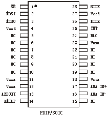 ISD4003系列TSOP及PDIP、SOIC引脚图 同相模拟输入(ANA IN+) 这是录音信号的同相输入端。输入放大器可用单端或差分驱动。单端驱动时,信号由耦合电容输入,最大幅度为峰峰值32mV,耦合电容和本端的3KΩ电阻输入阻抗决定了芯片频带的低端截止频率。差分驱动时,信号最大幅度为峰峰值16mV。这两种驱动方式见图2-14 (为ISD3300系列相同)。 串行输出(MISO) ISD的串行输出端。ISD未选中时,本端呈高阻态。 串行时钟(SCLK) ISD的时钟输入端,由主控制器产生,用于同步MOSI和MISO的数据传输。数据在SCLK上升沿锁存到ISD,在下降沿移出ISD。 中断(/INT) 本端为漏极开路输出。ISD在任何操作(包括快进)中检测到EOM或OVF时,本端变低并保持。中断状态在下一个SPI周期开始时清除。中断状态也可用RINT指令读取。 OVF标志----指示ISD的录、放操作已到达存储器的未尾。 EOM标志----只在放音中检测到内部的EOM标志时,此状态位才置1。 行地址时钟(RAC) 漏极开路输出。每个RAC周期表示ISD存储器的操作进行了一行(ISD4003系列中的存贮器其1200行)。该信号175ms保持高电平,低电平为25ms。快进模式下,RAC的218.75μs是高电平,31.25μs为低电平。该端可用于存储管理技术。
