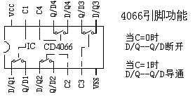 电路原理: 220V的交流市电经C1、R1降压,D1-D4整流得到12V左右的直流电,经C2滤波R2限流后再经VD稳压,C3滤波后得到稳定的5.6V直流电给红外线接收头和控制级供电。IR为红外线接收头,内部集成了红外线接收、放大、解调电路,当接收到遥控信号时,输出端输出低电平.主要控制电路由四双向模拟开关IC4066组成,功能引脚如下:
